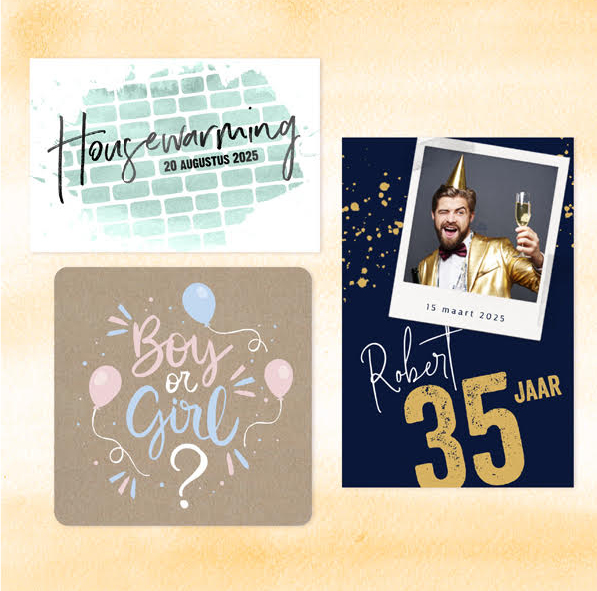 Het leven zit vol speciale momenten die we graag willen vieren of waar we bij willen stilstaan. Een verjaardag, jubileum, babyborrel of een andere mijlpaal. Op dit soort momenten brengen we de genodigden graag persoonlijk op de hoogte door een mooie, persoonlijke kaart te versturen. U kunt bij ons uw eigen ontwerp gemakkelijk uploaden en uw kaart geheel naar wens samenstellen.